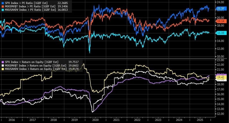 Figure 3 – The S&P 500 (SPX) Is Afforded a Higher Valuation Versus Minimum Volatility (M001MV$T) and High Dividend (MXUSAHDV) Even Though All Three Exhibit Similar Profitability Outlooks
