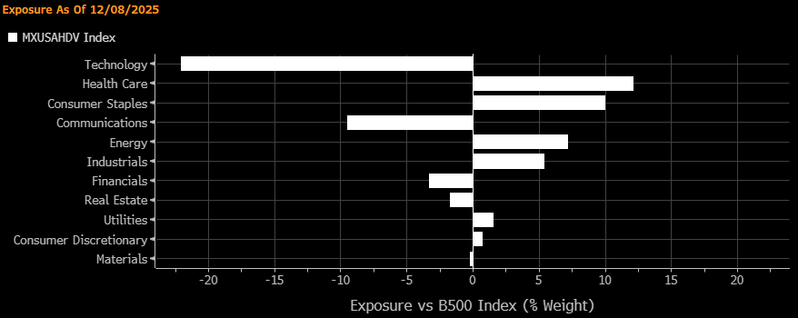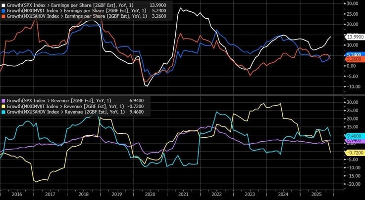 Even in the case of higher projected revenue growth for MSCI USA High Dividend (think industrial and energy infrastructure providers for the buildout of AI data centers), high dividend stocks suffer from lower earnings power since a large portion of excess earnings is paid out in dividends rather than reinvested in future capital spending and/or used to repurchase stock.