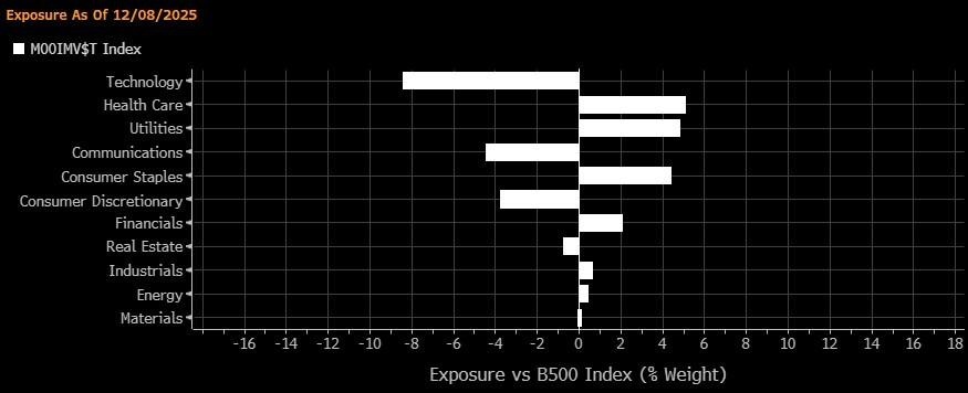 Source: Bloomberg TLTS Sector Relative Sector Weights versus the Bloomberg 500 Index.