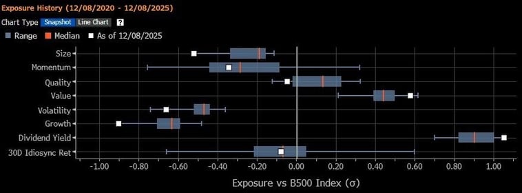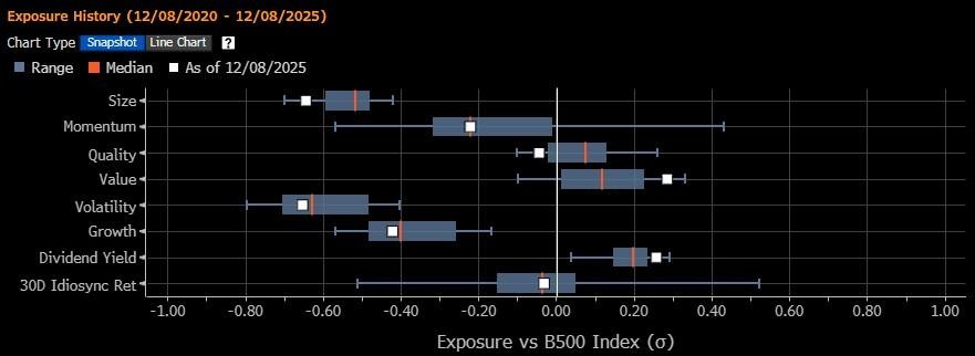 Source: Bloomberg TLTS Factor Exposures (standardized units) versus the Bloomberg 500 Index.