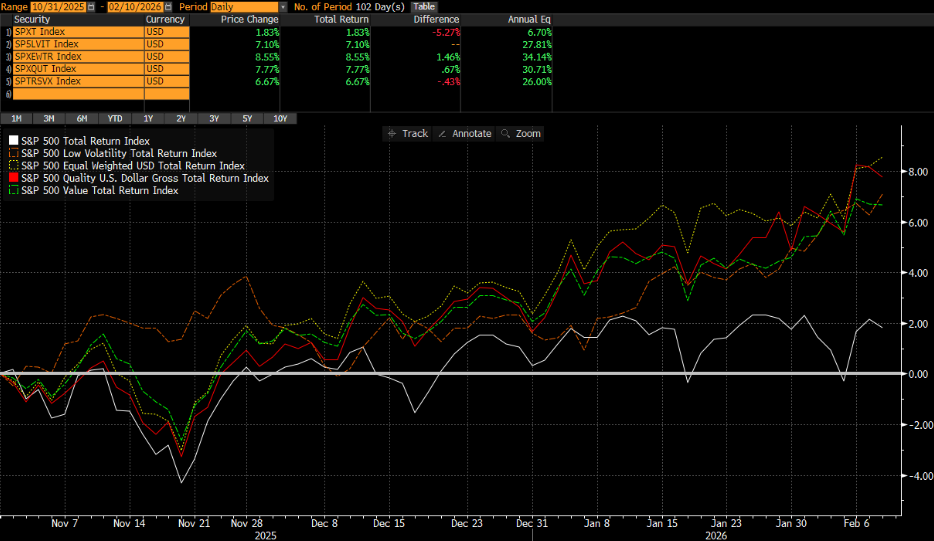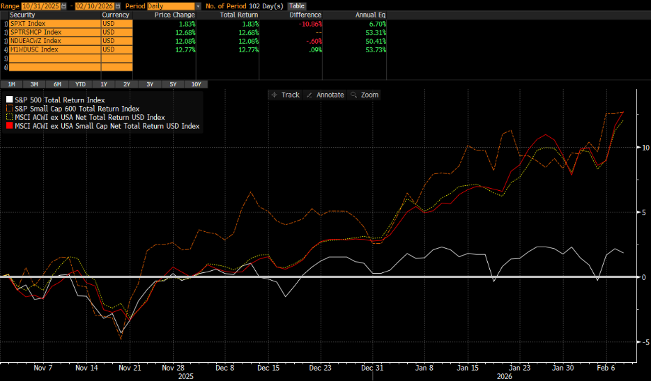 However, leadership shifted markedly starting in Q4 2025: small-cap laggards have outperformed large-cap leaders across geographies, sectors, and styles. The S&P 500 has now lagged the broader market in a meaningful way.