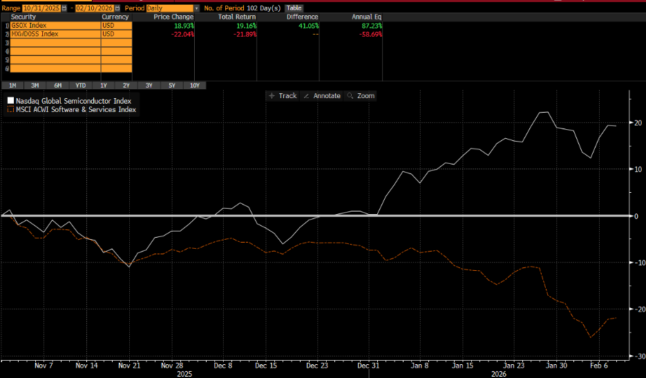 The AI story isn't fading; its effects remain concentrated in narrow pockets, such as surging demand for high-bandwidth memory or the derating of software-as-a-service (SaaS) valuations. Investors are reevaluating inelastic end-customer demand, potentially favoring affordable add-ons (e.g., new AI tools like Claude) over premium SaaS subscriptions.